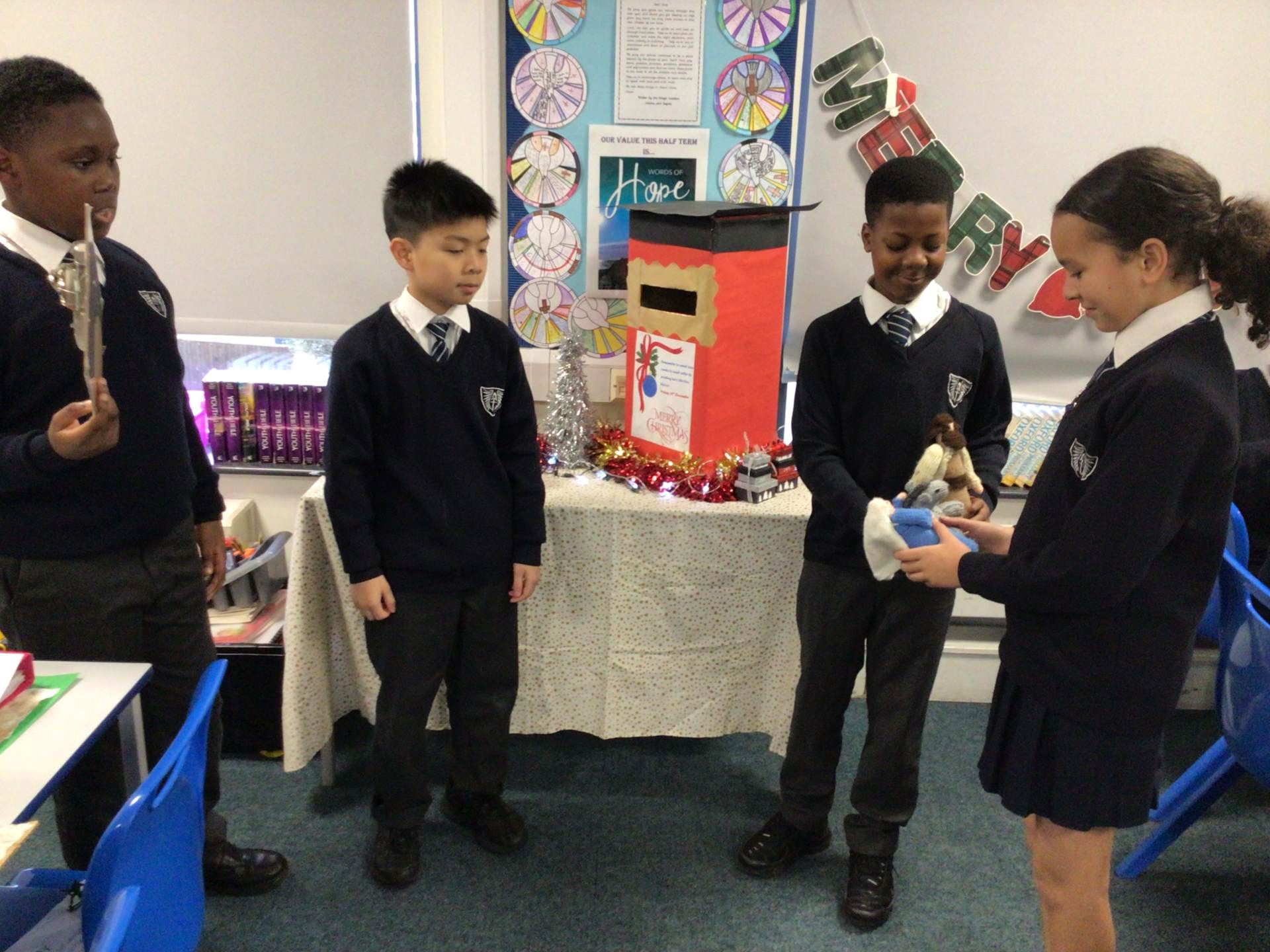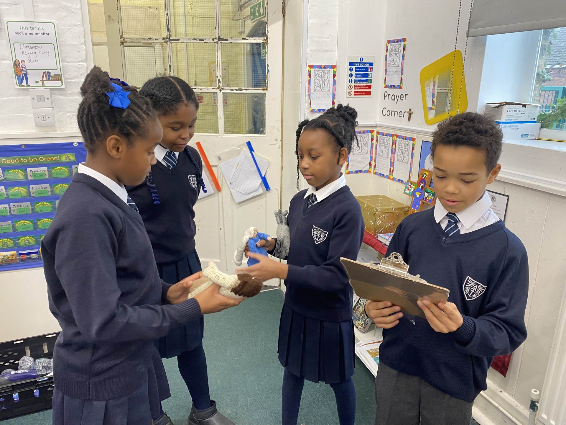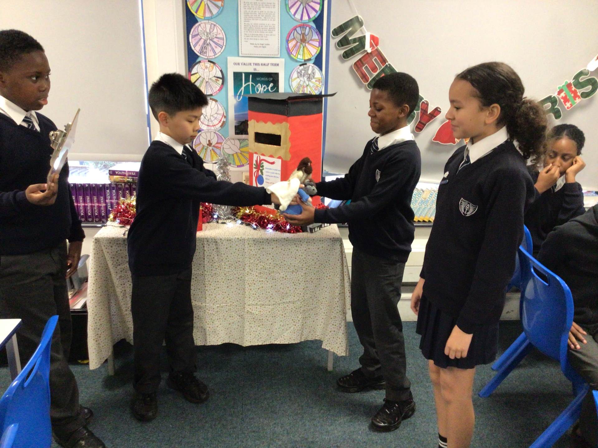 Our visitors are travelling from class to class until they arrive back in Collective Worship. Each time they travel to a new place, the same words are exchanged: