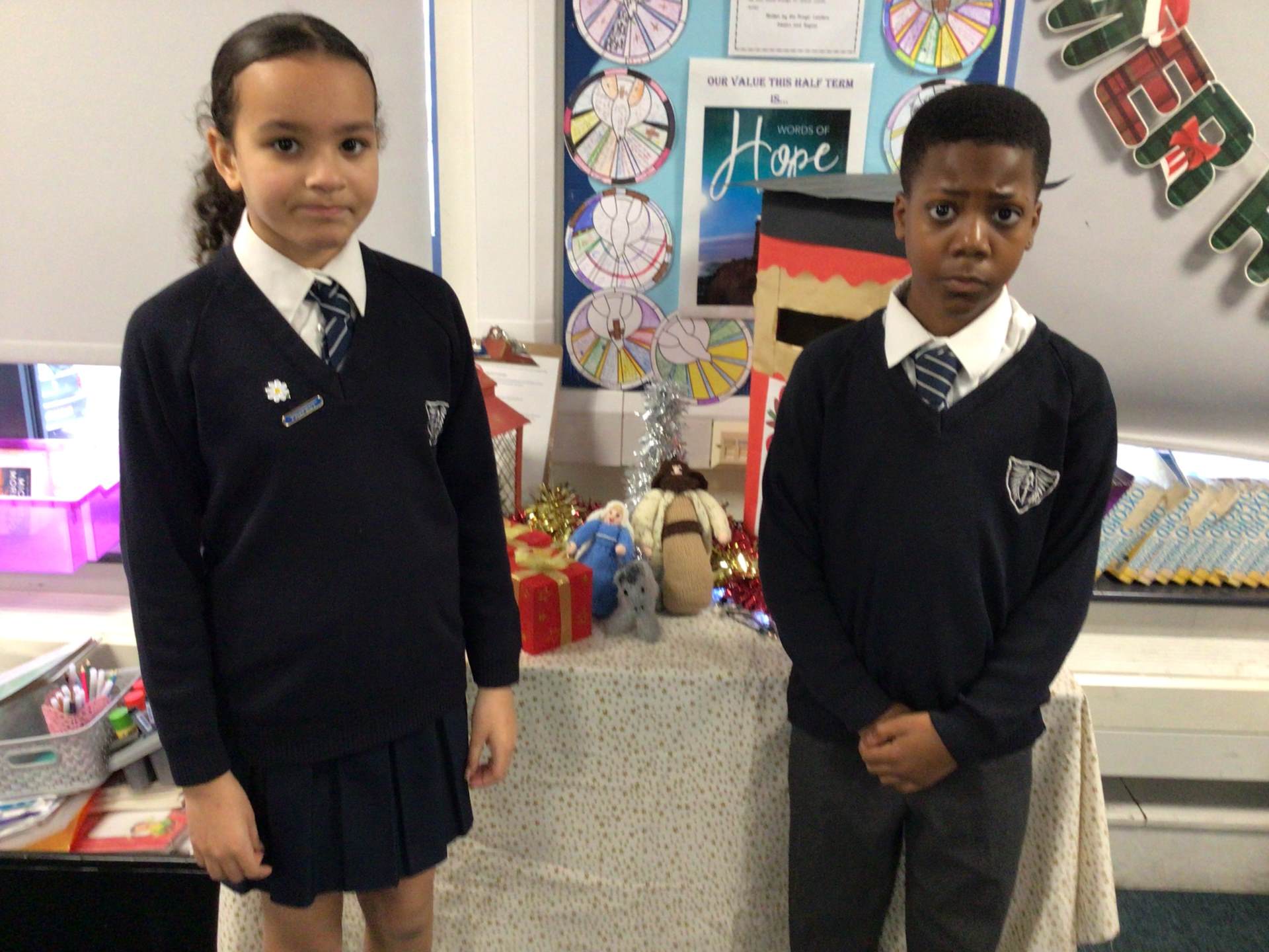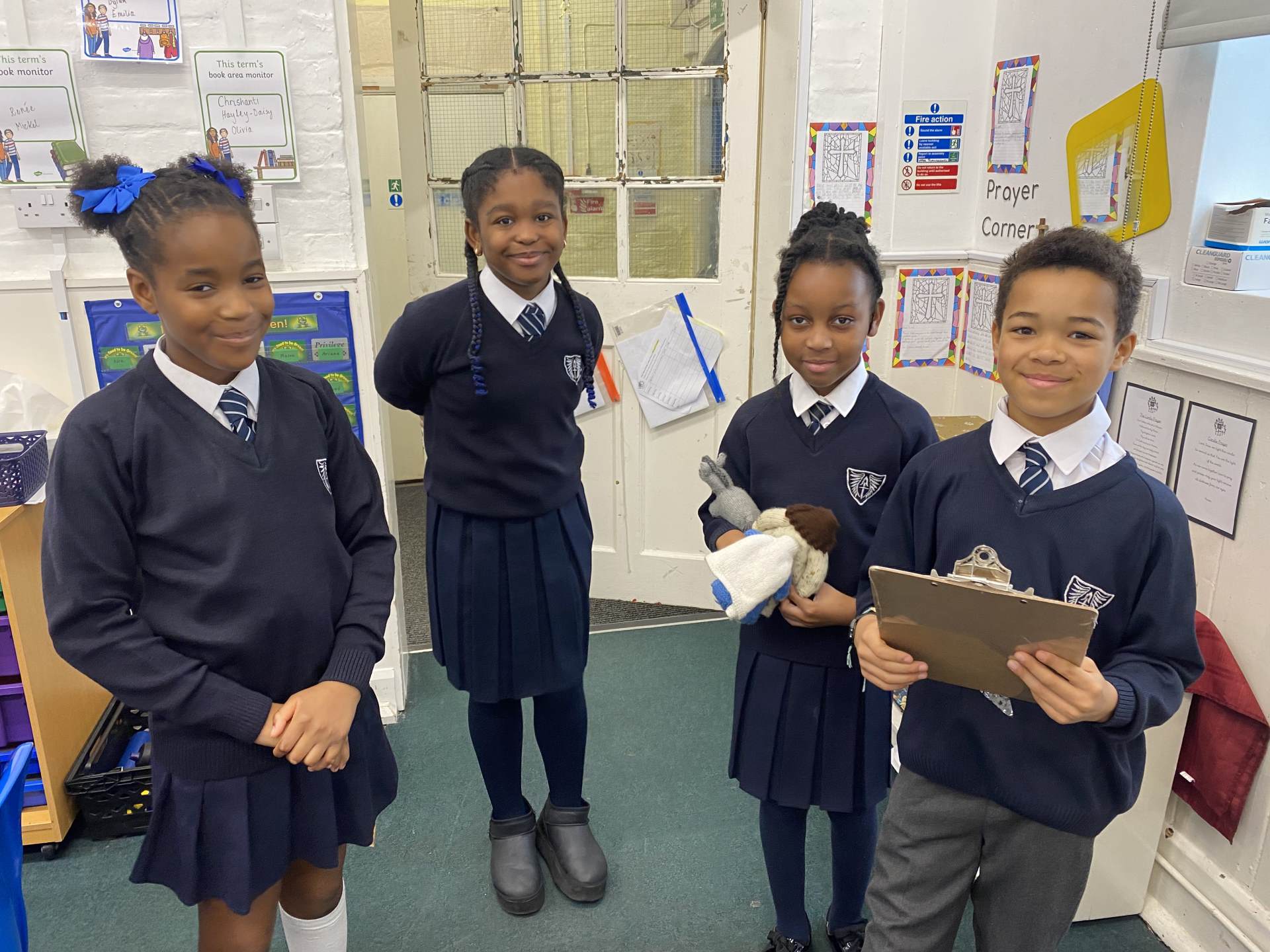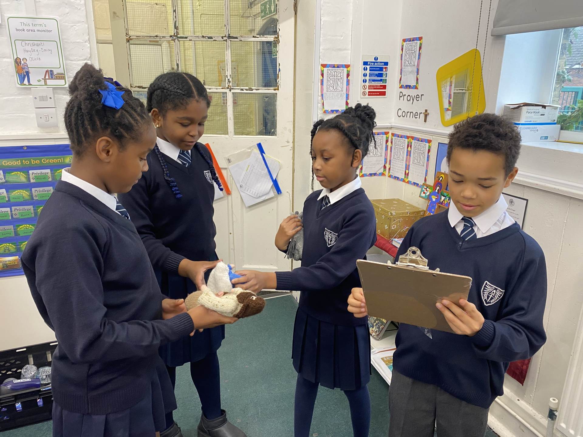 Our visitors are travelling from class to class until they arrive back in Collective Worship. Each time they travel to a new place, the same words are exchanged: